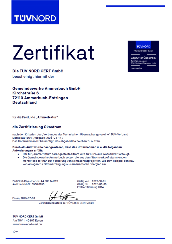 Die Gemeindewerke Ammerbuch GmbH bestätigen durch das TÜV Nord Zertifikat, dass der Bezug von Strom - voll und ganz aus Wasserkraft und dadurch ohne Luftschadstoffe oder radioaktiven Abfall - produziert wird.